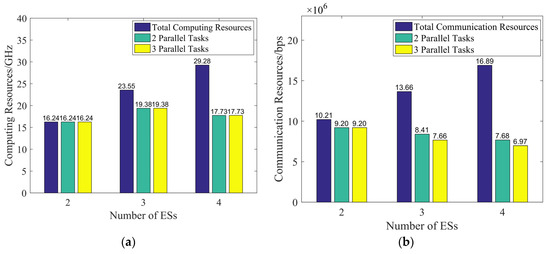 Figure 7a reflects the usage of computing resources under different numbers of edge servers. As shown in the figure, when the number of ESs is fixed, the dependency structures may vary, but the amount of computing resources consumed remains the same. This is because, regardless of the dependency structure in this case, the number of sub-tasks processed by the proxy ES in the optimal scenario is the same, the number of further distributed sub-tasks is the same, and the computing capability of each non-proxy ES is the same. Therefore, the amount of computing resources consumed is the same. Figure 7b shows the usage of communication resources in different situations. When the number of edge servers is two, regardless of the main parallel structure of the dependent task, the proxy ES distributes five sub-tasks externally; as such, the communication resources used in this case are the same. However, as the number of edge servers increases, the number of tasks assigned to each edge server under different dependent task structures varies, thus resulting in different usages of communication resources. Furthermore, the changes in total resources as shown in Figure 7a,b indicate that the more edge servers that are motivated to participate in the computation, the less resources each edge server contributes to, on average.