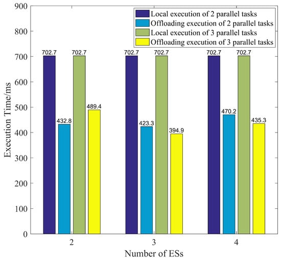 Figure 8 presents the impact of dependency structures and the number of ESs on the execution time of dependent tasks. When dependent tasks are fully executed locally, the dependency structure has no impact on the task, and thus its local execution time remains constant. For tasks primarily based on two parallel dependency structures, the execution time with three ESs is slightly less than with two edge servers. This is due to the waiting time for sub-tasks in the dependent tasks being greater than the communication time between edge servers. When the number of ESs is four, since the computing resources of each non-proxy ES are the same compared to when there are three ESs, the offloading optimal decision remains the same regardless of the parallel structure. However, as each edge server’s average resource contribution decreases and less resources are allocated to each task, the execution time increases. But, overall, the execution time of the dependent task under the incentive mechanism is lesser than the total local execution time.