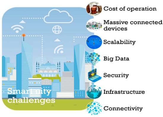 - Numerous devices: Smart cities require numerous sensors to collect data from various aspects of urban life. These sensors play a crucial role in transforming cities into intelligent, data-driven ecosystems. The proliferation of numerous devices in smart city development poses significant issues that should be handled to ensure smart cities’ effective and sustainable implementation. Communication networks of smart cities are anticipated to support dense deployment, which introduces many constraints on the design and development of such networks. These constraints include data management, ensuring coverage requirements, achieving network availability, and managing the communication overhead. Ensuring seamless communication and integration among numerous and heterogeneous smart city devices requires standardized interfaces and protocols.