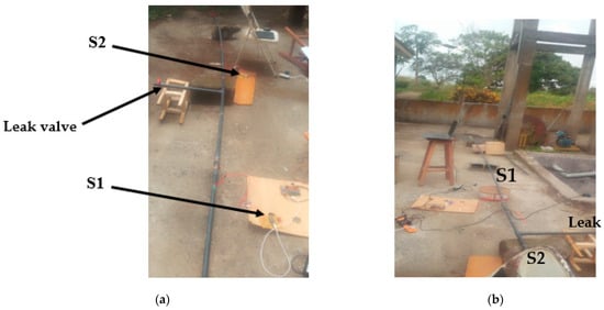 Laboratory testbed setup. (a) Position of sensor node’s S1 and S2 (b) water distribution pipeline.