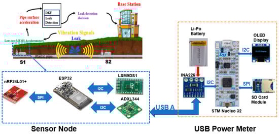 The WWPM system used for monitoring the laboratory WDN was composed of two sensor nodes S1 and S2, which were placed before and after the leak valve, respectively, in the direction of water flow (left to right) as shown in Figure 1. The main components of the sensor nodes comprised an ESP32 as the processing unit, a nRF24L01+ transceiver as the communication unit, a LSM9DS1 as the sensing unit, and a 3.7 V 2000 mAh Li-Po rechargeable battery as the power source, as depicted in Figure 2. Depending on the specific scenario under investigation, as discussed in Section 3, the connection or disconnection of an ADXL344 accelerometer may be optional, contingent upon the implementation of hierarchical sensing. For the processing unit, the ESP32 was used because it is a powerful, low-cost, and low-power MCU. It incorporates a double-core 32-bit Xtensa LX6 microprocessor and an ultra-low-power coprocessor (ULP).