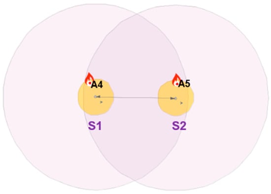 The simulation setup is shown in Figure 3 and is composed of two sensor nodes (S1 and S2) and natural event generators (A4 and A5). The natural event generators emulated the physical accelerometer sensors and were loaded with acceleration data collected from the laboratory testbed. The sensor nodes (S1 and S2) were loaded with scripts that implement the selected DKF algorithms during the simulations.