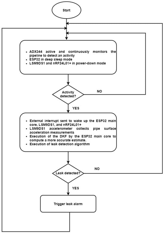 At the end of scenario 1, the DKF with the the highest power consumption from both simulations and experiments is selected. The selected DKF is then implemented on the sensor nodes alongside hierarchical sensing and duty cycling, and the energy consumption is monitored. The worst case was selected in order to evaluate the extent to which the hybrid technique will affect the energy consumption of the sensor nodes. The objective was to develop a WWPM system that can achieve both low-power consumption and real-time monitoring. Figure 4 depicts the flow of operations in our proposed fully distributed, real-time and low-power leak detection solution for WWPM using low-cost MEMS accelerometers that implements the hybrid technique.