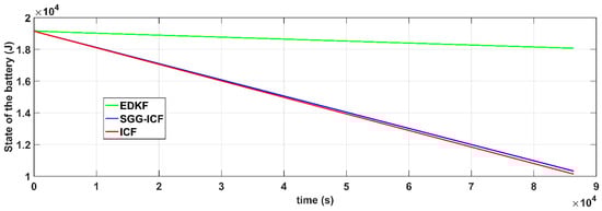 State of charge of sensor node’s battery for the selected DKF implementations: (a) EDKF, (b) ICF, (c) SGG-ICF.