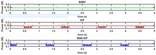 For each of the DKF implementation, we measured the current and voltage of the nodes. Figure 6 represents the power profile of sensor S2 in the case of the EDKF, ICF, and SGG-ICF implementations.