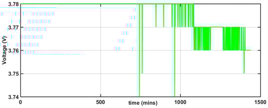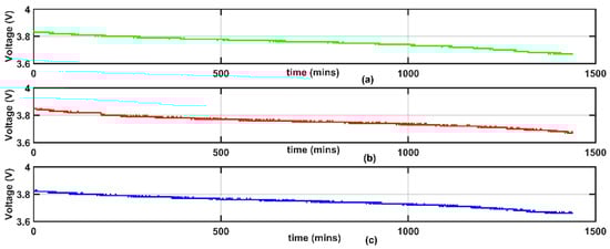 Figure 7 demonstrates the accurate monitoring of the State of Charge (SOC) of the battery experimentally by observing the evolution of the battery’s voltage over time. From observation, the battery discharge profiles for all three DKF implementations are found to be approximately the same at the end of one day, as indicated in Figure 7. The SOC of the battery is computed from the battery voltage measurements using Equation (5). Calculating the difference between the SOC at the beginning and end of the one-day experimental period yields the percentage of battery usage over that period. The results of these calculations are presented in Table 5.