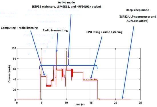 - When no activity is detected by the ADXL344 accelerometer, the ESP32 stays in the deep sleep mode with the ULP coprocessor active, while the nRF24L01+ transceiver and the LSM9DS1 accelerometer both remain in the power-down mode.