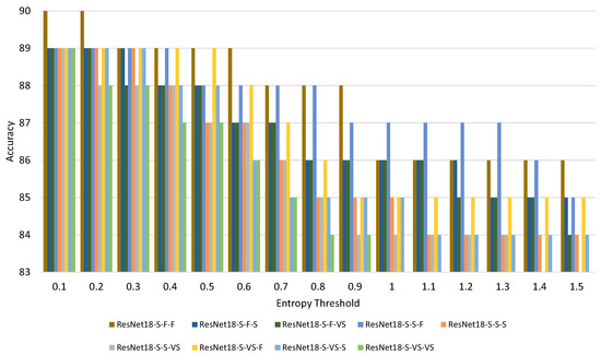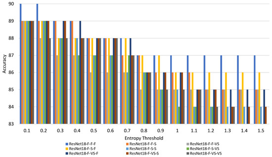where is the probability associated with a class. The classification of an image is considered confident if , where is the entropy threshold of the confidence. The threshold determines the ratio between the accuracy and inference runtime. As the threshold is reduced, the number of images that need to be classified with the more accurate model increases, which increases the accuracy of the dual model. However, since the more accurate and slower model is executed more times, the average runtime of the dual-model inference increases.