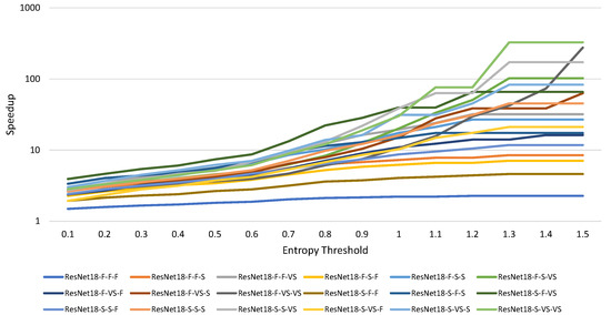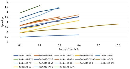 Considering the accuracy, it is interesting to observe that the dual model is able to improve the accuracy of the ResNet50 model and still achieve some speedup. For example the combination of ResNet18-F-F-F with ResNet50 achieves an accuracy of 90% with a speedup of 1.5. To further understand why this happens, a detailed analysis of the outcomes of both models was carried out. This could only happen if the lower-accuracy model was correctly classifying some instances that were incorrectly classified by the higher-accuracy model. This fact was observed, and it also slightly compensates for some false positives. This observation is also valid for other entropy thresholds but, as we increase this threshold, the false positives also increase, and the peak accuracy is no longer observed.