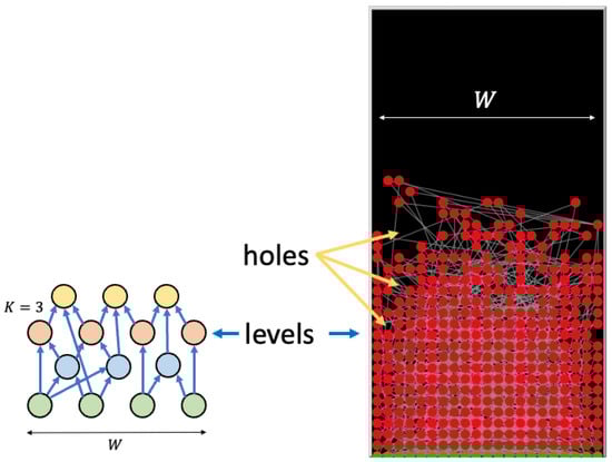 In the snapshot of Figure 1 right, “knowledge holes”, i.e., missing items at levels which are lower than the highest one, and that will be subsequently filled, are clearly shown. Notice that holes are evident in this fixed-width version, but can be identified also in the variable-width model by observing the temporal filling of the structure, i.e., the appearance of items below the maximum ones. We revise the properties of our actual model, which were already presented in Ref. [], in Section 4.