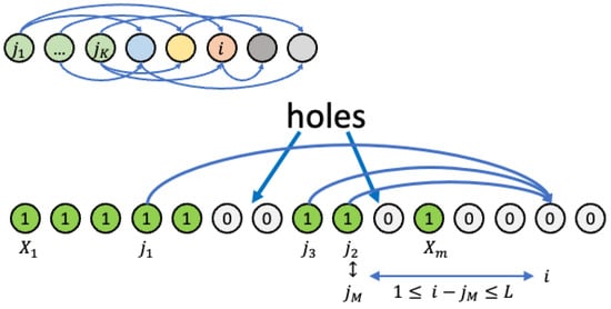 The linear scaffolding model. In this version, there are no well-defined levels. Known items are denoted by ones in a linear array of elements (X), and unknown ones by zeros. The “highest” known item is at position m. New items (i) become known () if all random prerequisites are known. The maximum knowledge jump L limits the choice of i so that , where is the highest of prerequisites . In the figure, the proposed new item i is based on prerequisites , , and ().