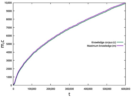 Comparison, between the evolution of the knowledge corpus (c) and maximum knowledge (m) vs. time for 10,000, and .