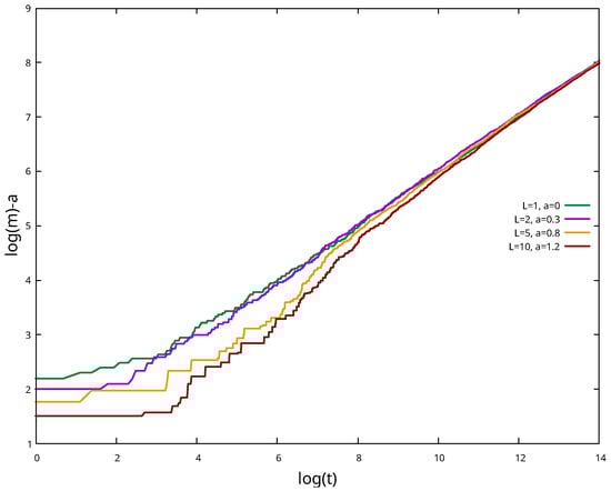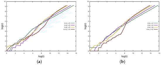 By plotting in a log–log scale, as shown in Figure 4, we noticed that, regardless of the values chosen for L and K, it is asymptotically approximated by a power law: