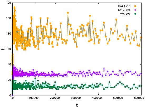 Time evolution of the number of holes (h) for 10,000 and different values of K and L.
