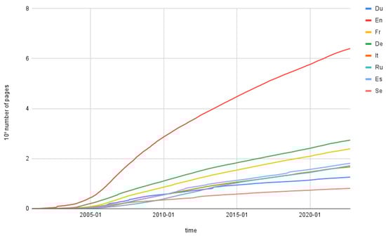 Wikipedia has become the only nonprofit venture among the Internet’s top 100 most popular websites [] and an important resource for many students, but also for numerous experts, even at an academic level []. Since 2001, Wikipedia’s number of pages has grown every year.
