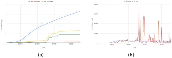 We are interested in studying the evolution of Wikipedia as a knowledge corpus. As explained in Ref. [], there are many ways to measure the size of Wikipedia. We used the number of articles (pages that have encyclopedic information on it) as a measure of the corpus size, growing as shown in Figure 7. We considered the number of page edits as an indication of the number of holes of information.