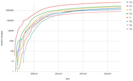 - Wikipedia. Wikipedia: Size of Wikipedia. Available online: https://en.wikipedia.org/wiki/Wikipedia:Size_of_Wikipedia (accessed on 10 January 2023).