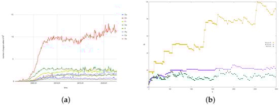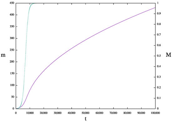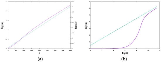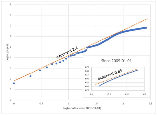 The early phases of Wikipedia’s growth (2003–2009) can be modeled by an exponential curve, as in Ref. [], or by a power law with a large exponent, as shown in Figure 10. The latest phase (since 2009) is more coherent with power-law growth with an exponent of less than one, between and . Our mathematical model asymptotically follows power-law growth with