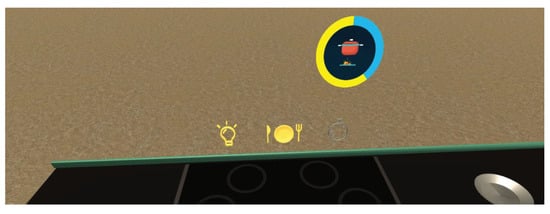 The idea (See Figure 10a) developed by students is to assist the user through an intuitive and interactive three-dimensional interface using simulated AR. The GUI is based on the use of three-dimensional icons that can be easily interpreted by any kind of user so as not to burden and hinder the view of the user, who is already busy preparing food. For this reason, students opted for only three icons positioned outside the worktop, while all the other icons can be temporarily hidden and activated only when the user wants.