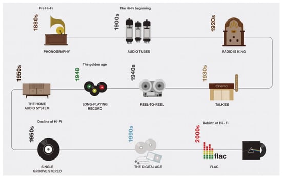 Infographic about the evolution of Hi-Fi systems, from phonography to digital music.