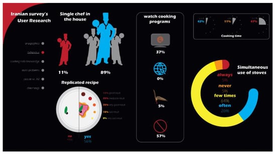 The user research starts with a questionnaire administered to a sample of 125 people of different cultures—Italian and Iranian—aimed at discovering their typical behaviors towards the hob they use. The questionnaire is structured into topic areas (i.e., anagraphic data, behavior in the kitchen, kitchen hob knowledge, main interaction problem, AR knowledge and satisfaction, and their dream) that provide valuable information to develop the concept. The user research identifies several problems related to the hob’s different features. For example, if users have some unforeseen situation and need to move away from their hob, it is impossible to manage the cooking time and turn off/on/adjust the flame. Moreover, users often forget an ingredient while cooking (e.g., salt for pasta), and unless users remember it themselves, it is impossible to solve this problem. Additionally, when users must follow a recipe, they are forced to follow either video recipes or physical cookbooks, which are difficult to handle on the hob for several reasons (e.g., stove danger, hygiene, busy hands, etc.).