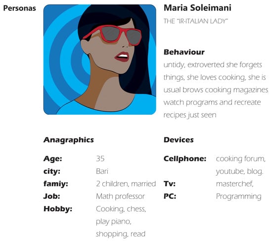 Example of a persona. Maria is represented by her anagraphic data (i.e., age, city, family, and job), behavior, hobbies, and devices that she uses, including the actions that she performs.