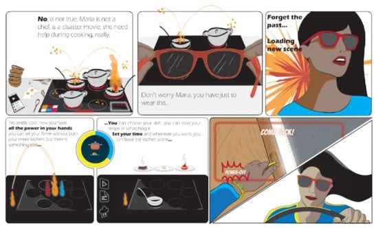 Example of a scenario. Maria wears AR glasses and controls the hob remotely. Maria can choose between three different options for the dish to prepare: video recipe, recipe book, and cooking program. Maria is guided during the preparation, and she is always informed about the status of the dish.