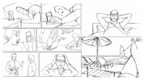 The scenario is usually defined by setting, actors, objectives or goals, sequence of events, and result (See Figure 5) []. This phase also includes the creation of storyboards and drawn tables that elaborate the scenarios related to the target user. A design storyboard is powerful means for the designer because by telling a story about (parts of) the interaction(s), it enables the reader access to the expressed ideas on two levels: communication and experience []. Storyboards support industrial designers in getting a grip on context and time, forcing them to pay attention to different aspects, integrate these aspects, and address implications that might be put off with abstract considerations. Storyboards can be sketched (i.e., by pencil; See Figure 6) or digital (i.e., made with vector-graphics editing programs such as Adobe Illustrator), evoking comment and reaction or detailed and closed, conveying facts and convincing.