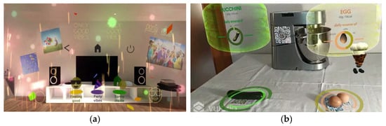 The simulated AR interface (See Figure 11b) allows users to see inside the fridge, without opening its door wearing AR smart glasses. The user, through this interface, will be able to see all the products, which are divided into compartments. The products highlighted in red by the interface are the first to expire, while the products highlighted in green indicate the freshest products. The GUI allows users to view from a distance what the fridge contains and how to manage all the food it contains, avoiding waste. It is also possible to have this experience in Metaverse by discussing with friends about foods to buy from the supermarket and dishes to cook.
