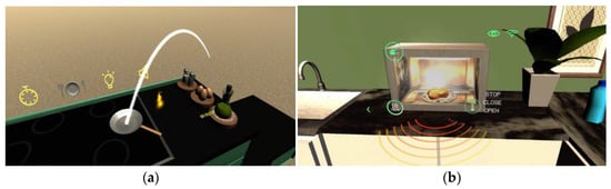 The GUI (See Figure 10b) lets users use the microwave correctly, presenting a simple and intuitive graphic canvas that guides the user step by step in the insertion of food and its cooking, paying attention to the safety of these steps. This solution allows the user to enhance the interaction with the microwave, facilitating some operations that are difficult in real life without simulated AR. It also allows for remote interaction with friends and those who want to participate in the cooking experience with users in the Metaverse.