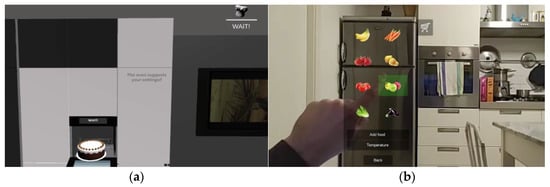 The project idea (See Figure 11a) is to increase the oven functionalities and control using AR contact lenses to remotely control ovens that are currently on the market. The GUI allows users to choose the food to be cooked in the oven and set the cooking mode through three-dimensional and intuitive icons. The project enhances human–machine interaction through a GUI that uses not only simulated AR but also artificial intelligence to make human–oven interaction easier and more successful. Additionally, in the Metaverse, it could be possible to share the experience of cooking in the oven and, while waiting for the dish, to talk with friends.