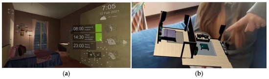 In this project (See Figure 12a), the interface presents different three-dimensional icons and related functionalities in simulated AR. The GUI allows users to wake up with another person and/or share sleep and fall asleep with other people with the same problem, even in the Metaverse scenario. Since many users have difficulty falling asleep and waking up, this solution presents an immersive experience—a reality amplified through the enrichment of human sensory perception—by superimposing digital content on reality.