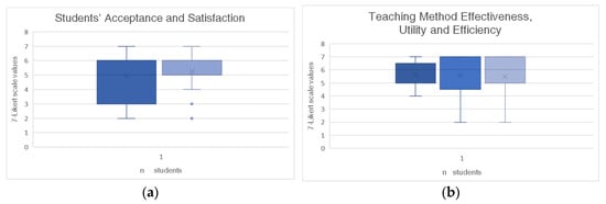The group projects demonstrate how the students acknowledge the theory and laboratory part of the courses and can synthesize MR adoption, GUI design, and product innovation. We also want to evaluate other aspects of the students’ experience in order to obtain preliminary results related to the novel multidisciplinary laboratory. Therefore, at the end of the final presentation of each team, we ask the students the following questions using a 7-point Likert scale [] to evaluate acceptance, effectiveness, utility, efficiency, and satisfaction [].