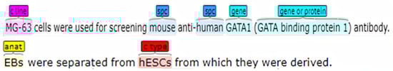 IE has also become a critical activity in the biomedical domain, as biomedical text is also publishing at an increasing rate. Biomedical named entity recognition (BioNER) identifies the biomedical concepts and assigns them to predefined categories such as genes, chemicals, diseases, etc., as shown in Figure 1. In practice, performing the BioNER task is more challenging than a standard NER task as biomedical documents are different from standard text data (e.g., newspaper articles) in several ways. Although there are certain practices followed by researchers for writing biomedical concepts, still, no strict rules exist for the biomedical domain. With open and growing biomedical literature, it becomes more challenging to follow the same naming convention. Another issue concerns the classification of the entities. Different human annotators, even with the same background, can sometimes associate the same word with diverse medical concepts, e.g., “p53” corresponds to a protein in the GENIA corpus. In contrast, the HUGA nomenclature annotates it as a gene “TP53” [].