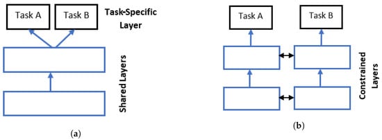 The multitask learning (MTL) approach allows different tasks to share their knowledge among themselves using shared layers in their architecture, thus helping to improve the performance of another task []. MTL is an inductive learning process that learns to generalize by utilizing the knowledge of different tasks []. When the tasks are sufficiently related, they can provide an inductive bias that forces models to learn generally useful representations []. Two different methods are used in the MTL approach, i.e., hard parameter sharing and soft parameter sharing, which are shown in Figure 2. Hard parameter sharing is the most common method used in MTL, where a complete sharing (i.e., parameters) of hidden layers among different tasks is done. This article also focuses on the hard-parameter-sharing approach. In soft parameter sharing, separate models are created for different tasks. These models are then somehow enforced to loosely match the parameters of the shared layers, most commonly done by regularizing the parameters of the shared layers.