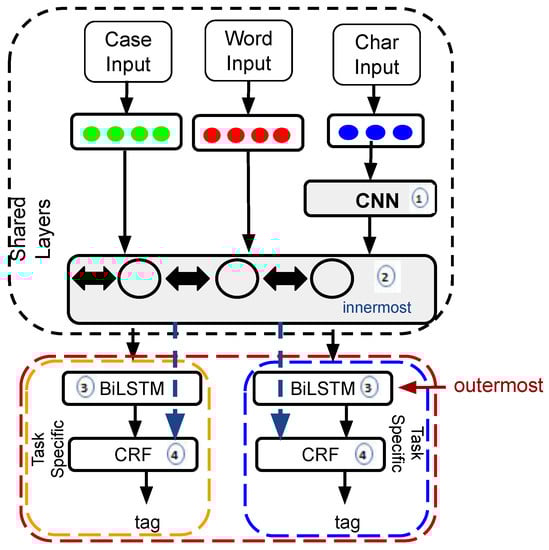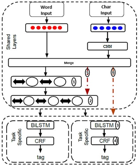 Third, the MTM-CNN implements stacked layers of BiLSTM units in contrast to []. The stacked BiLSTM units encourage each of them to perceive the hidden pattern of the data exhibited at various time stamps. This helps the BiLSTM network to gain knowledge of the features at a more abstract level. The first innermost BiLSTM layer (marked by the circled 2 in Figure 3) is shared among all the tasks while the second layer of BiLSTM (shown by the circled 3 in Figure 3) is task-specific. The MTM-CNN exploits CRF (represented by the circled 4 in the figure) at the output layer for final sequence labeling. CRF performs a tagging of the current token by considering neighboring tags at a sentence level []. Yang et al. [] performed experiments with both CRF and Softmax and concluded that CRF produced better results compared to Softmax.
