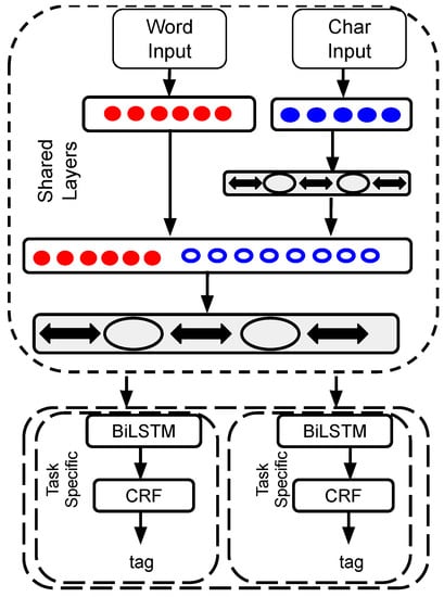 - Peng, N.; Dredze, M. Multi-task multi-domain representation learning for sequence tagging. arXiv 2016, arXiv:1608.02689. [Google Scholar]