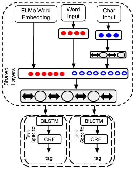 - Hashimoto, K.; Xiong, C.; Tsuruoka, Y.; Socher, R. A Joint Many-Task Model: Growing a Neural Network for Multiple NLP Tasks. In Proceedings of the 2017 Conference on Empirical Methods in Natural Language Processing, Copenhagen, Denmark, 9–11 September 2017; pp. 1923–1933. [Google Scholar] [CrossRef]