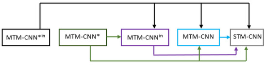 The performance of the models was analyzed statistically, and the Friedman test was applied to the models’ outputs. The Friedman test is suitable when three or more comparisons are drawn [,]. Figure 7 shows that the difference between the results produced by the proposed models and their variants was statistically significant. All MTMs results were significantly better than the STM-CNN results. The result of the MTM-CNN (GENIA-POS and CoNLL used at the innermost layer) was found significantly better with respect to all approaches except for the (GENIA-POS and CoNLL used at the outermost layer).