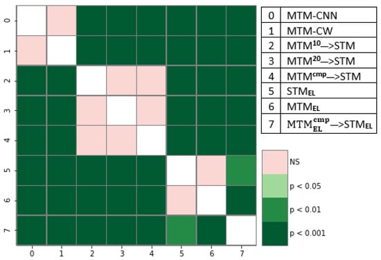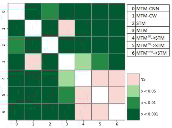 The statistical analysis was also extended with the pairwise comparison of different models to see which model was statistically better than the others. The graphical representation of the pairwise comparison is shown in Figure 10. The MTM-CW was found statistically better than the rest of the approaches on its right side. It can be seen that the MTM-CNN was statistically worse compared to the other models.