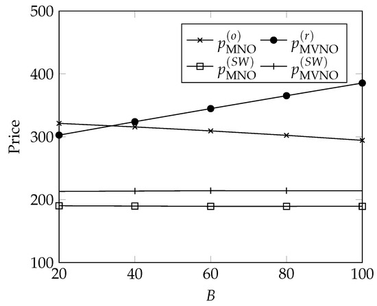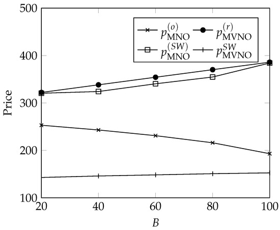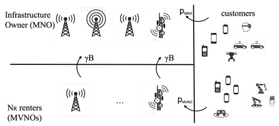 In our case, we have opted to study a typical situation where we have a single MNO and N R MVNOs, where MNOs and MVNOS compete for end customers and charge them a flat-rate plan (which encompasses the prepaid, postpaid, and monthly plans described above), where customers pay a fixed amount (respectively, p MNO for the MNO and p MVNO ( i ) for the i-th MVNO) for each period of time. On the other hand, the MNO charges a flat rate γ B with a fixed amount B of bandwidth allotted to each customer. The revenues coming from end customers are then proportional to the number of customers, whereas the revenues of the MNO coming from MVNOs are proportional to the number of MVNO’s customers and the bandwidth allotted to them. The relationship between customers, the MNO, and MVNOs is illustrated in Figure 1.