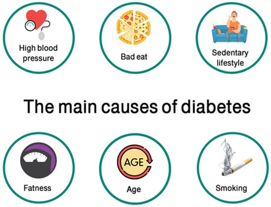 Diabetes is principally caused by obesity or high glucose level [15]. Due to increased glucose levels in the blood, some symptoms arise within the flesh, such as frequent urination and extreme hunger. Normal glucose levels are 70 to 99 mg/dL. Furthermore, a human is considered pre-diabetic if the body glucose concentration is 100–125 mg/dL [16]. Detection of diabetes in its early stages is one of the most critical challenges in the healthcare industry. Diabetes has no permanent cure. Hence, early detection is crucial in the treatment process [17]. Figure 2 illustrates the leading causes of diabetes.