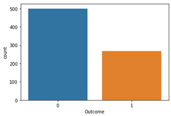 There may be no specific age for the onset of type 2 diabetes, but the age factor dramatically increases the chances of developing the disease. The dataset contains 768 labels for diabetes, where a label 1 means the patient has diabetes and 0 otherwise. Of these 768 records, 500 are labeled as 0 and 268 as 1. Table 1 illustrates a sample from the collected dataset. Figure 5 shows the total outcome of diabetic and non-diabetic patients.