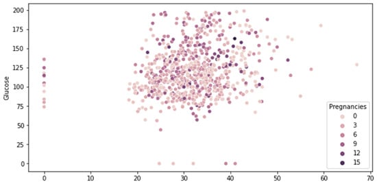 Scatter plots are usually used to plot data points on vertical and horizontal axes with the attempt to show how much one variable is related to another or to look for a relationship between different variables, where the better the correlation, the tighter the points will hug the line. Figure 8 illustrates scatter plots visualizing glucose vs. BMI vs. pregnancies.