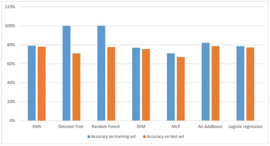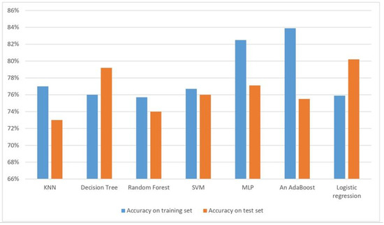 In this study, we used K-nearest neighbors, decision tree classifier, deep learning (multilayer perceptron (MLP)), support vector machine (SVM), random forest classifier, an AdaBoost classifier and logistic regression. All these algorithms were applied on the PIMA Indian dataset. Of the records, 80% in the dataset were used for training; the remaining 20% was used for testing. Table 2 lists the obtained results, and the results are visualized in Figure 9.