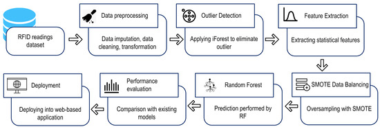The proposed model in Figure 1 uses RSS and timestamps to predict tag movement and direction. Data pre-processing was done to remove inconsistent data and missing values were replaced with the mean. Outlier detection based on iForest has been applied to the RFID readings dataset so that the outliers can be eliminated. Statistical features were extracted from RSS and timestamps and the SMOTE technique was applied to generate new instances of the minority class. The RF algorithm was used for prediction and performance was evaluated by comparing the proposed model to other machine-learning models. The trained model was then integrated into a web-based application for easy use by end users. The evaluation of the model was done using stratified 10-fold cross-validation, a variation of k-fold cross-validation where each subset contains the same proportion of class labels as the original dataset.