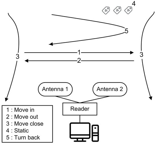 RFID, or Radio-Frequency Identification, is a technology that uses radio waves to communicate between a reader and a tag attached to an object. RFID is considered a part of the Internet of Things (IoT) because it allows for the identification and tracking of physical objects over the internet, enabling them to connect and communicate with other devices and systems. This enables real-time monitoring, automation, and remote control of the objects. RFID tags can be placed on products and used to monitor their movement in and out of a warehouse by installing RFID readers at the gates. However, the reader cannot determine the direction of the tags, whether they are entering or exiting the warehouse. Previous studies have shown that using the received signal strength (RSS), timestamps, and machine-learning algorithms can be used to determine false positive tags [10,11,12,13,14]. However, these studies have not evaluated different types of tag movement that may occur in real-world scenarios. Therefore, it is important to use machine-learning models to identify the direction of tags by considering different types of tag movement to improve the efficiency of the RFID gate [15,16,17,18].
