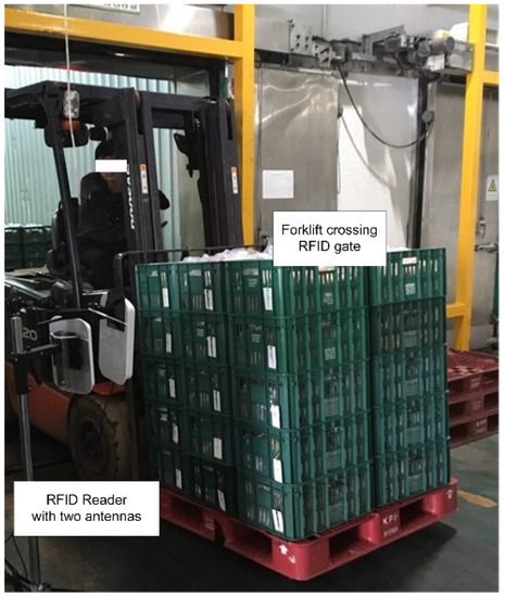 The dataset in [17,35] was gathered by considering various possible movements and directions of tags that can happen in real warehouse environments such as moving in and out through the gate, moving near the gate, turning back, and static tags (Figure 2). The setup used for this scenario was a single reader with two antennas, one installed outside and the other inside the warehouse gate. This allows for the recording of tagged products moving in and out of the warehouse. However, the RFID reader may also pick up false positive readings like when the product is moved near the gate, during a turn-back movement, or from static tags. These static tags occur when tags are located within the nominal read range or when the range is extended accidentally by metal objects within the field. The prediction model in this study is utilized to record the products that move in or out through the gate and filter out false positive readings. Figure 3 illustrates an example of tagged products moving in through the gate in a real warehouse.