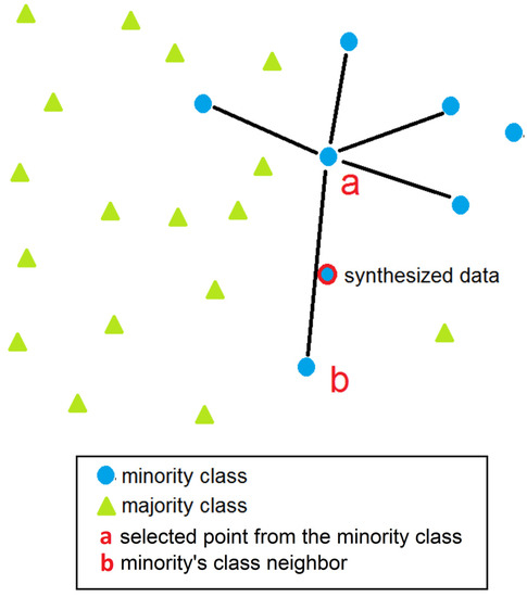 The SMOTE (Synthetic Minority Over-sampling Technique) is a method used to increase the number of minority class instances in a dataset by generating new synthetic instances of the minority class [29]. This is done by randomly selecting the nearest neighbors of each minority class sample and creating new synthetic samples between them (see Figure 4). In this study, SMOTE was applied to our training set during Stratified 10-Fold CV in order to balance the training set, so that could improve prediction accuracy.