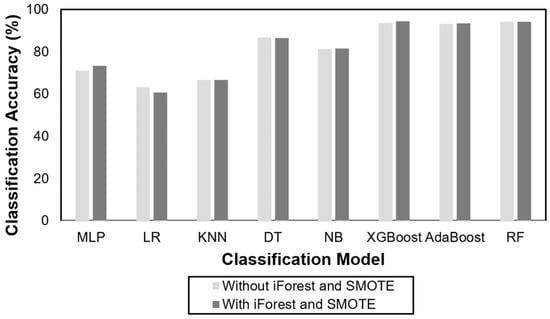 In this study, we examined the effect of iForest outlier detection and SMOTE on the accuracy of classification models. We found that the implementation of these techniques slightly improved the accuracy of the models. After removing noisy or outlier data and balancing the training set, the average accuracy of the classification models increased by about 0.13% compared to conventional machine learning models. Figure 5 shows the detailed impact of outlier detection and oversampling on classification accuracy. In our dataset, removing outliers and increasing the distribution of minority cases generally improved classification model accuracy, except for logistic regression. In conclusion, integrating iForest-based outlier detection and SMOTE for balancing the dataset into classification models can improve model accuracy.